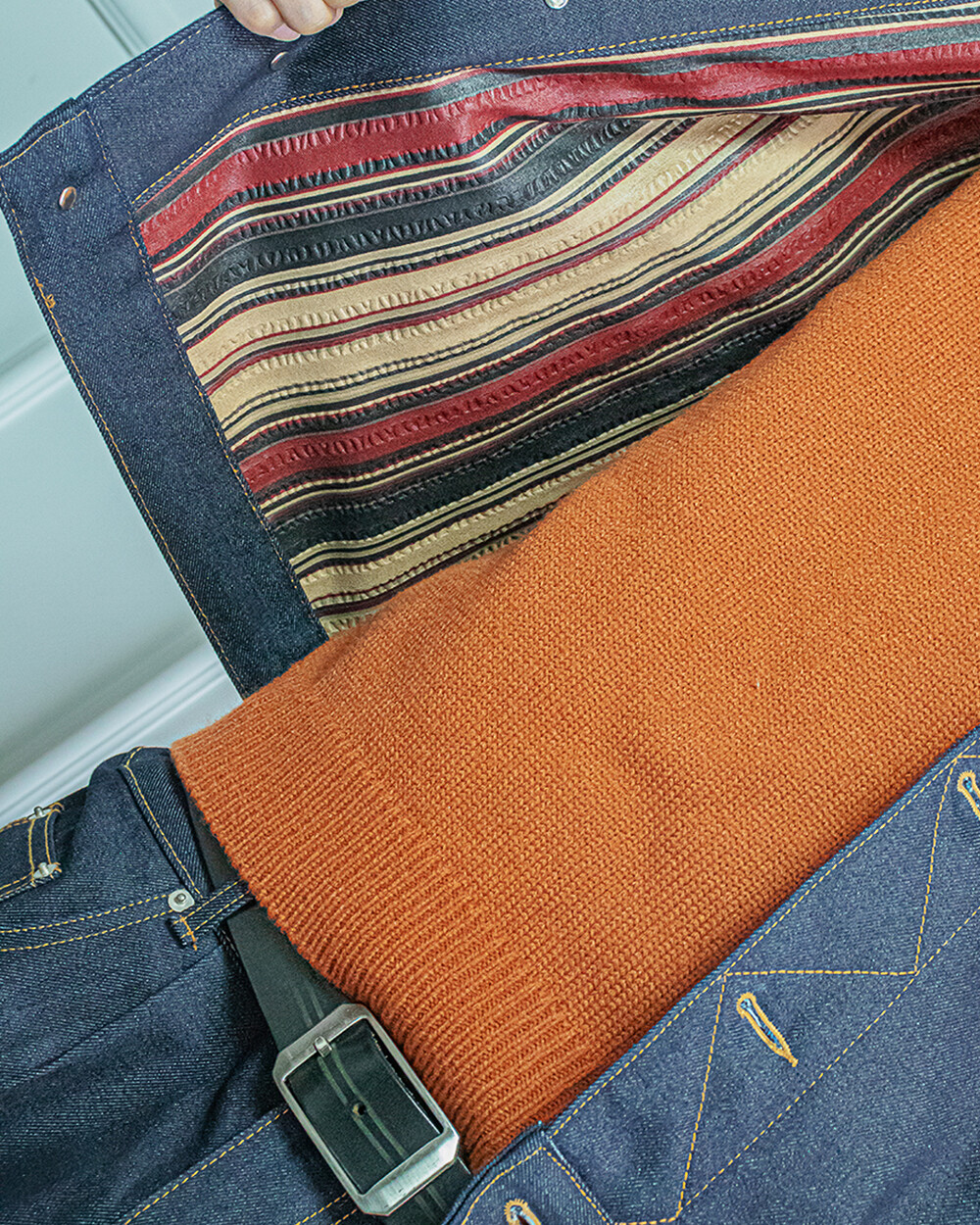 거친 원단에 알맞은 체인스티치 봉제기법으로 더욱 견고하게 제작하였습니다.