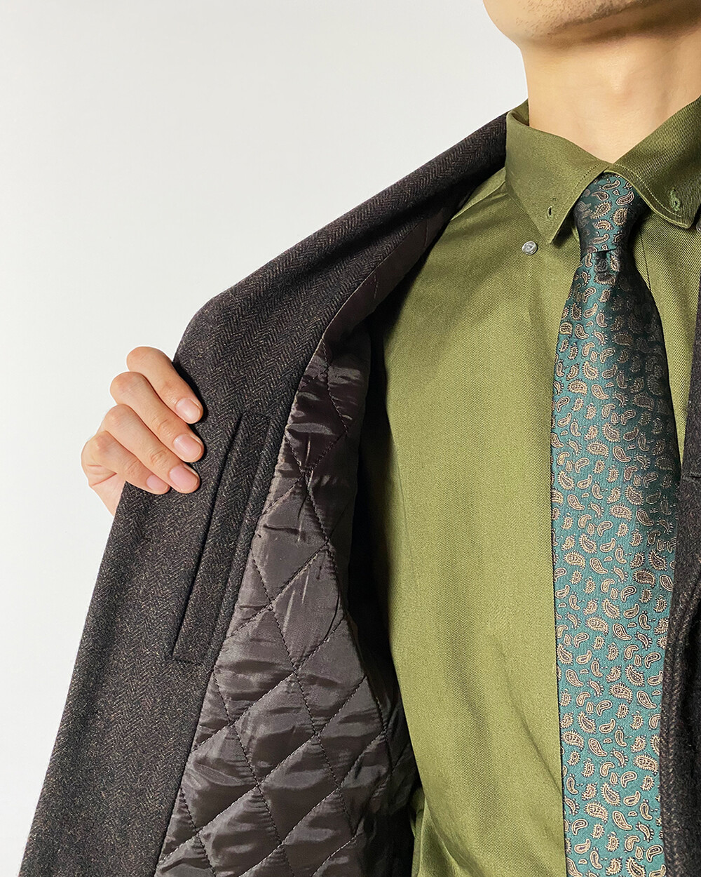 뒷 목부터 자연스럽게 떨어지는 숄라펠은 과하지 않게